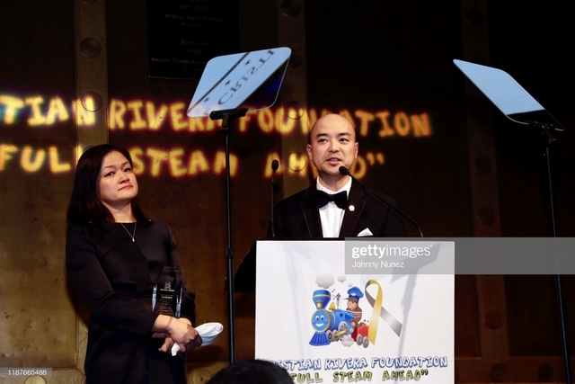 NEW YORK, NEW YORK – NOVEMBER 13: Honorees Sansan Harashima (L) and Hide Harashima speak onstage at the 11th Annual Cristian Rivera Foundation Celebrity Gala on November 13, 2019 in New York City. (Photo by Johnny Nunez/WireImage)